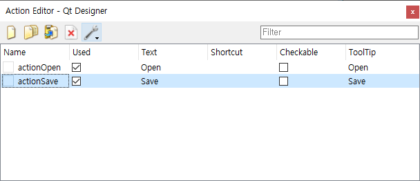 위의 코드는 액션을 정의하면서 해당 액션에 대한 단축키를 지정하고 액션을 툴바와 메뉴에 추가하여 단축키를 누르거나, 메뉴를 선택하거나 툴바 버튼을 눌러도 동일하게 액션의 triggered() 시그널에 따라 지정한 슬롯으로 연결된다.